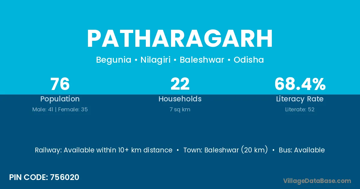 Baleshwar (20 km) is the nearest town to Patharagarh village for major economic activities and is located approximately 20 km away.