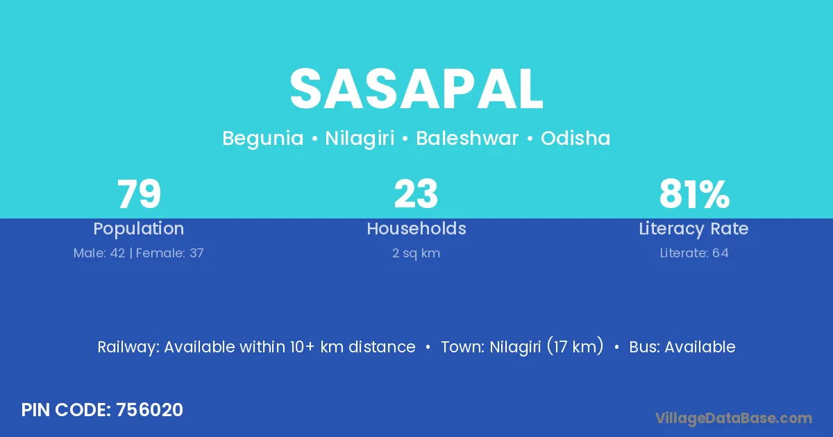 Nilagiri (17 km) is the nearest town to Sasapal village for major economic activities and is located approximately 17 km away.