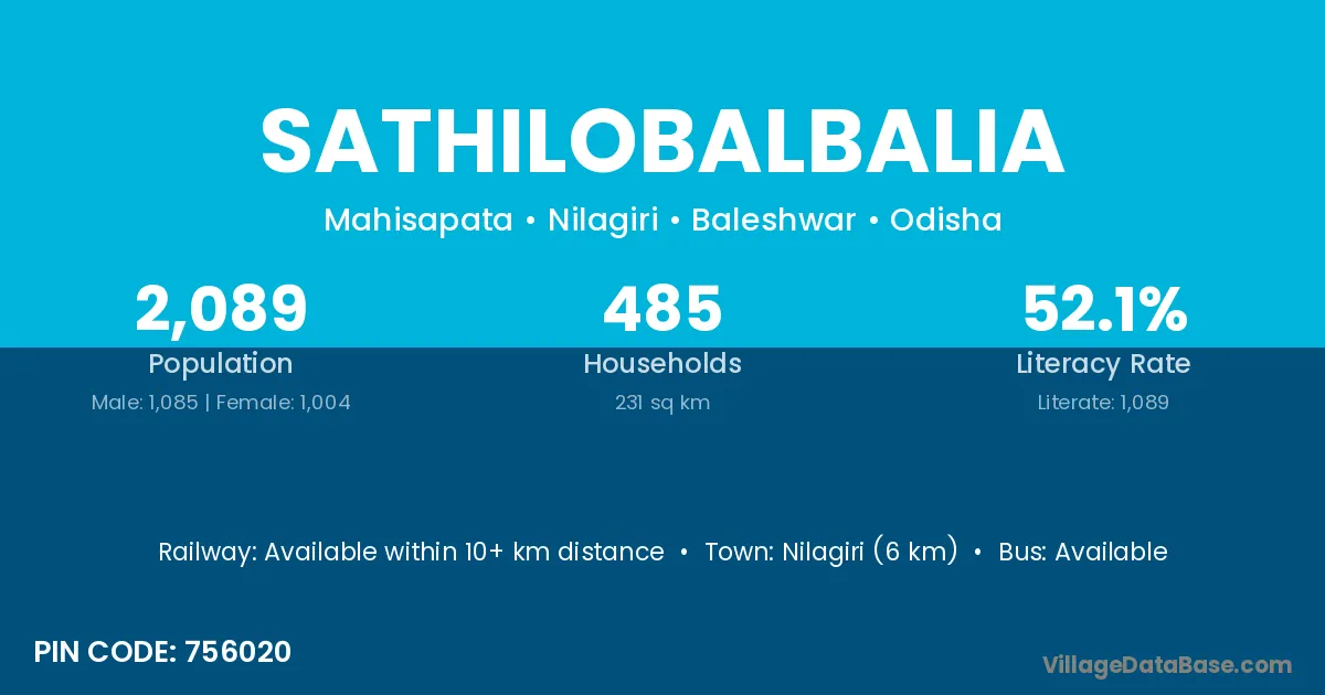 Sathilobalbalia village has a total population of 2,089 people, of which 1,085 are males and 1,004 are females.