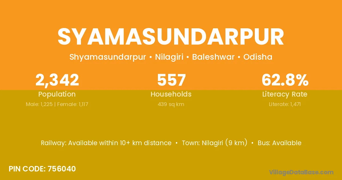Nilagiri (9 km) is the nearest town to Syamasundarpur village for major economic activities and is located approximately 9 km away.