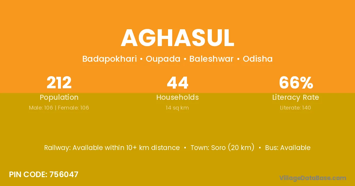 The literacy rate of Aghasul village is 66.04%. Male literacy stands at 74.53% and female literacy at 57.55%.