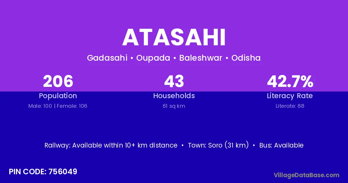 Atasahi village has a total population of 206 people, of which 100 are males and 106 are females.
