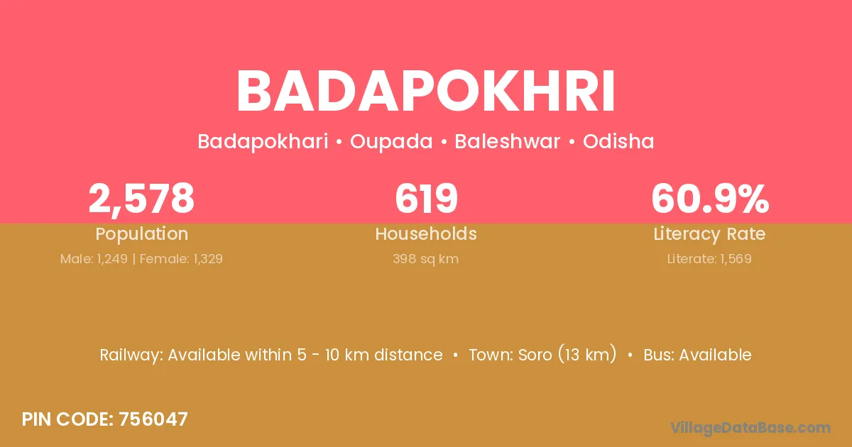 Soro (13 km) is the nearest town to Badapokhri village for major economic activities and is located approximately 13 km away.