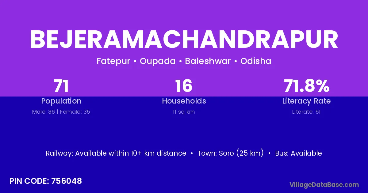 Bejeramachandrapur village has a total population of 71 people, of which 36 are males and 35 are females.