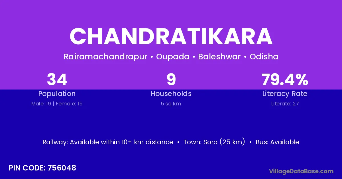 Chandratikara village has a total population of 34 people, of which 19 are males and 15 are females.
