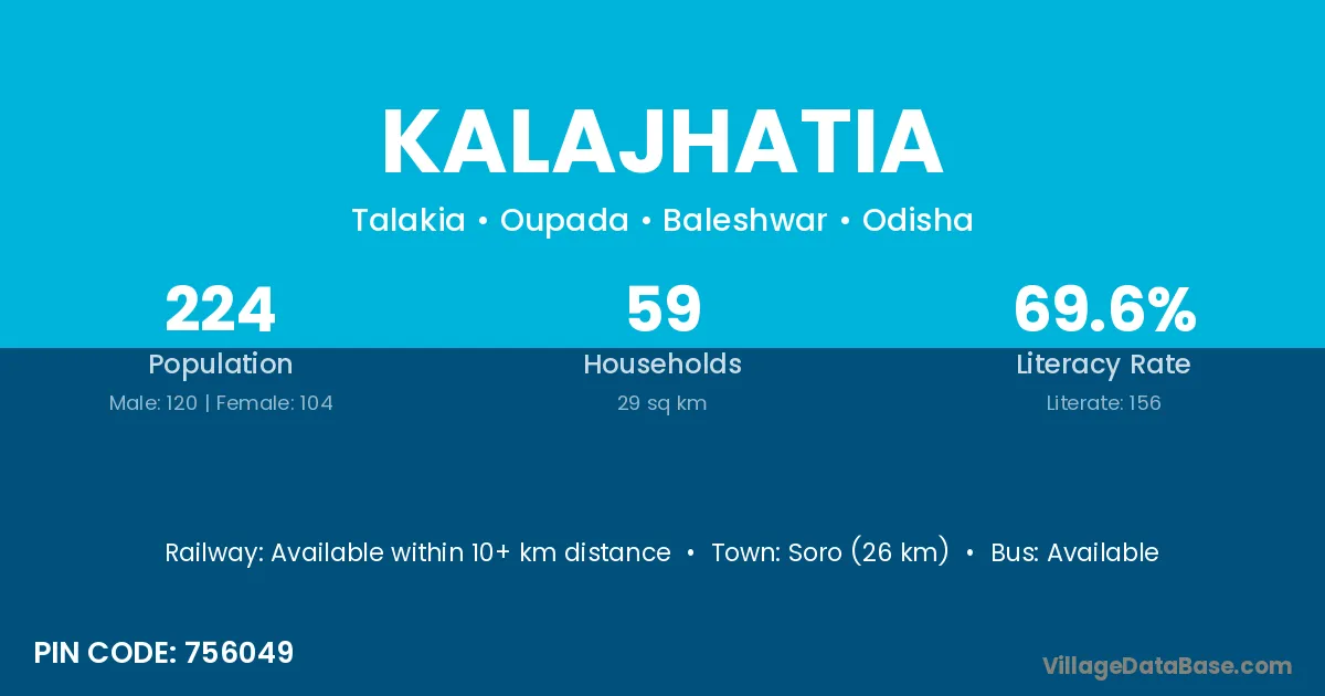 Kalajhatia village has a total population of 224 people, of which 120 are males and 104 are females.