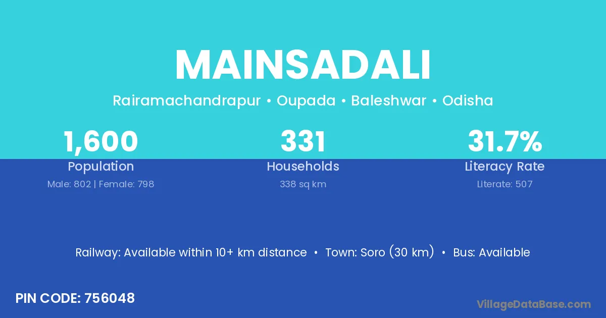 Soro (30 km) is the nearest town to Mainsadali village for major economic activities and is located approximately 30 km away.