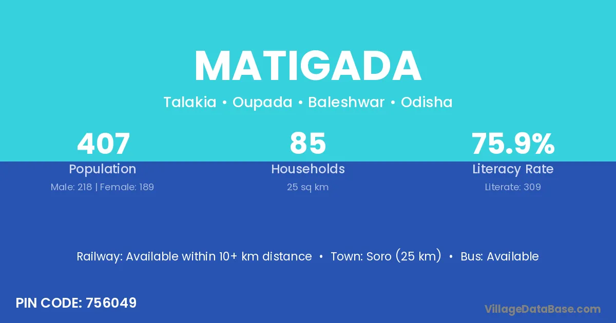 Matigada village has a total population of 407 people, of which 218 are males and 189 are females.