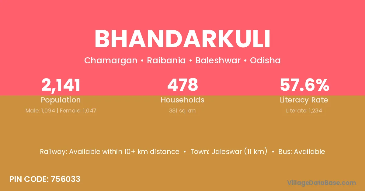 Jaleswar (11 km) is the nearest town to Bhandarkuli village for major economic activities and is located approximately 11 km away.