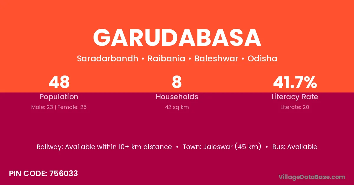 Jaleswar (45 km) is the nearest town to Garudabasa village for major economic activities and is located approximately 45 km away.
