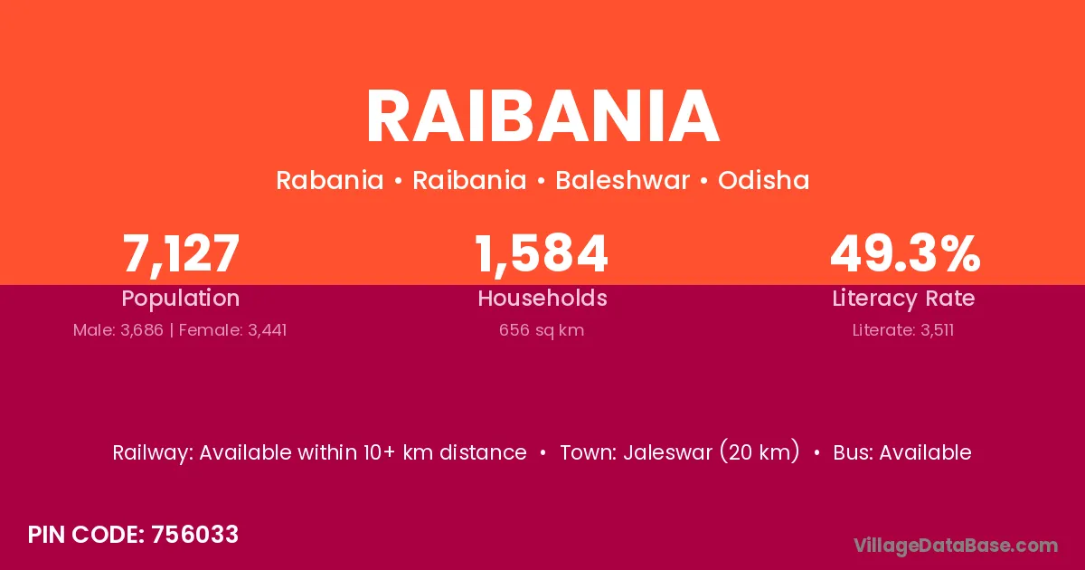 Jaleswar (20 km) is the nearest town to Raibania village for major economic activities and is located approximately 20 km away.