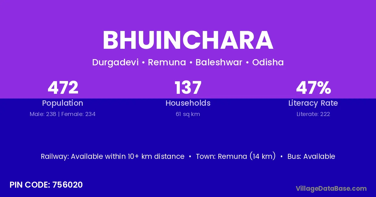 Remuna (14 km) is the nearest town to Bhuinchara village for major economic activities and is located approximately 14 km away.