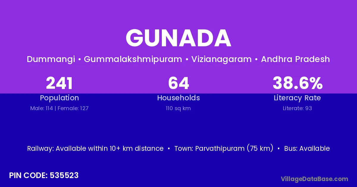 Remuna (15 km) is the nearest town to Gunada village for major economic activities and is located approximately 15 km away.