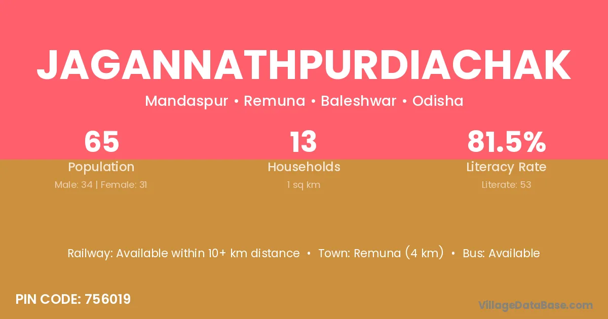 Remuna (4 km) is the nearest town to Jagannathpurdiachak village for major economic activities and is located approximately 4 km away.