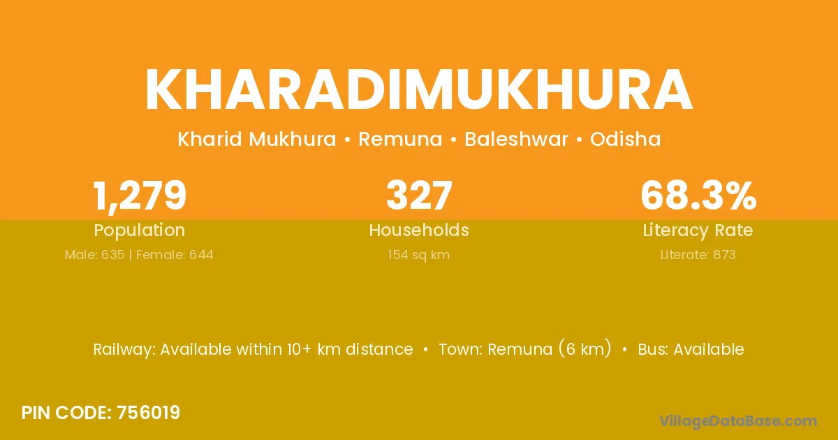 Kharadimukhura village has a total population of 1,279 people, of which 635 are males and 644 are females.