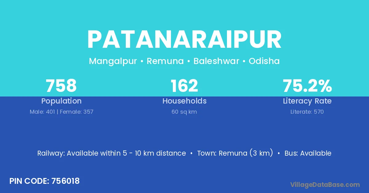 Patanaraipur village has a total population of 758 people, of which 401 are males and 357 are females.