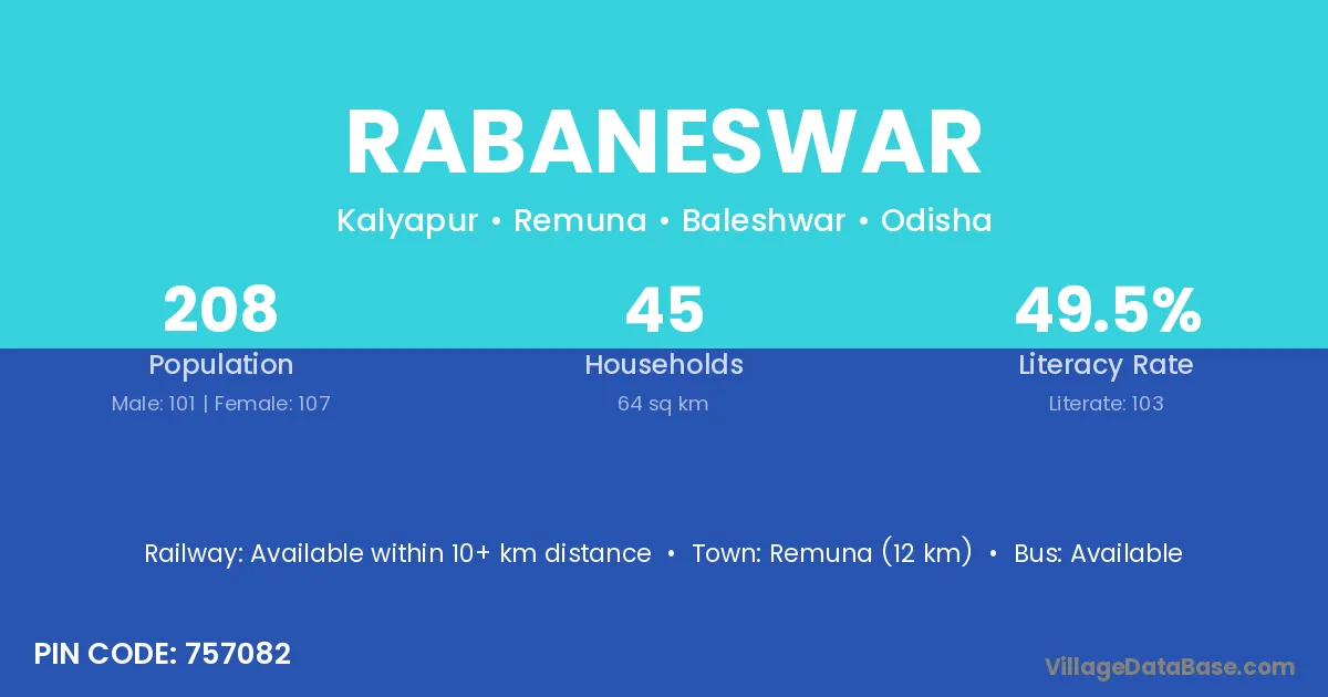 Remuna (12 km) is the nearest town to Rabaneswar village for major economic activities and is located approximately 12 km away.
