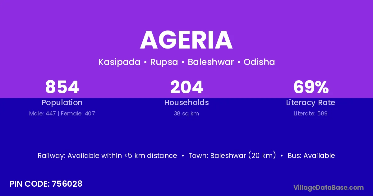 Baleshwar (20 km) is the nearest town to Ageria village for major economic activities and is located approximately 20 km away.