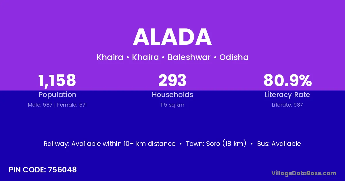 Bhadrak (20 km) is the nearest town to Alada village for major economic activities and is located approximately 20 km away.