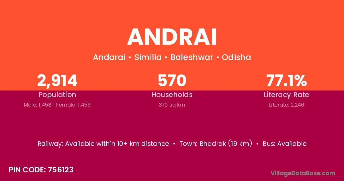 Bhadrak (19 km) is the nearest town to Andrai village for major economic activities and is located approximately 19 km away.