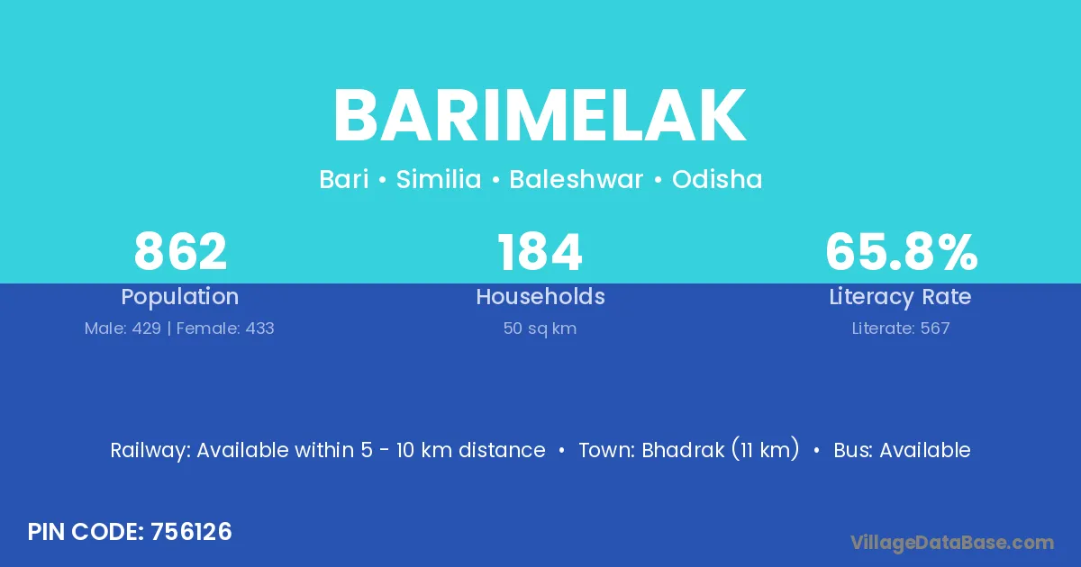 Bhadrak (11 km) is the nearest town to Barimelak village for major economic activities and is located approximately 11 km away.