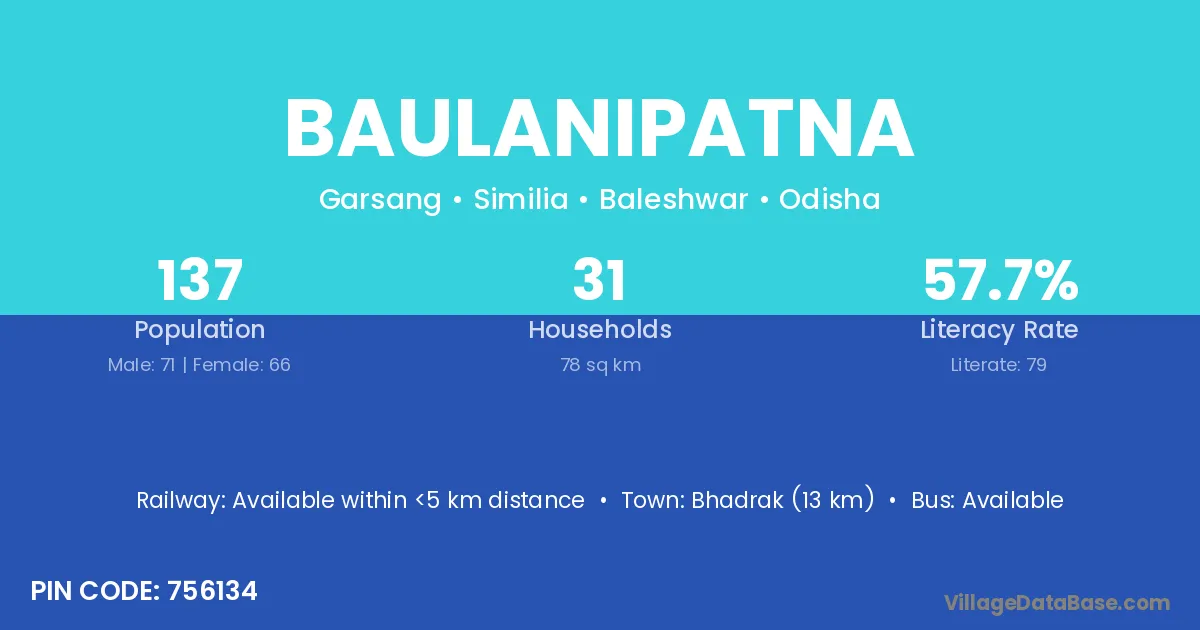 Bhadrak (13 km) is the nearest town to Baulanipatna village for major economic activities and is located approximately 13 km away.