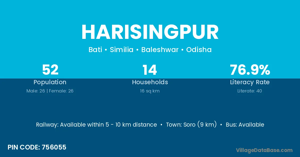 Soro (9 km) is the nearest town to Harisingpur village for major economic activities and is located approximately 9 km away.