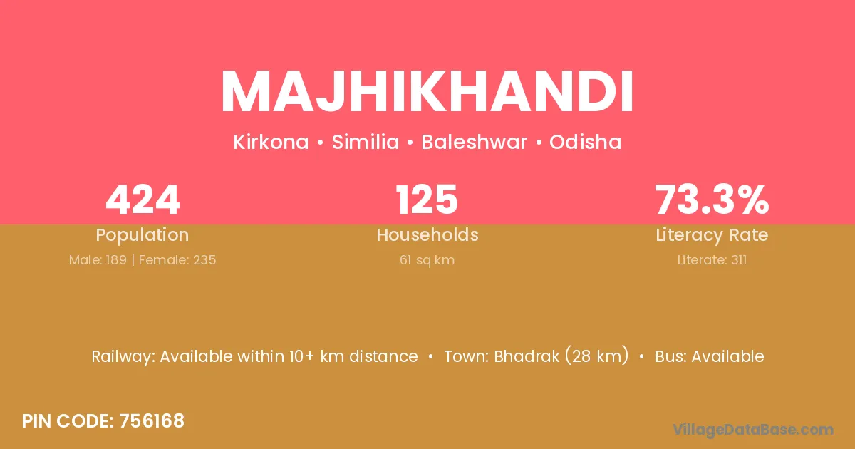 Bhadrak (28 km) is the nearest town to Majhikhandi village for major economic activities and is located approximately 28 km away.