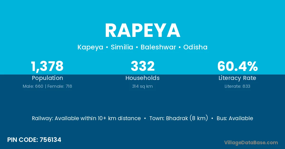 Bhadrak (8 km) is the nearest town to Rapeya village for major economic activities and is located approximately 8 km away.