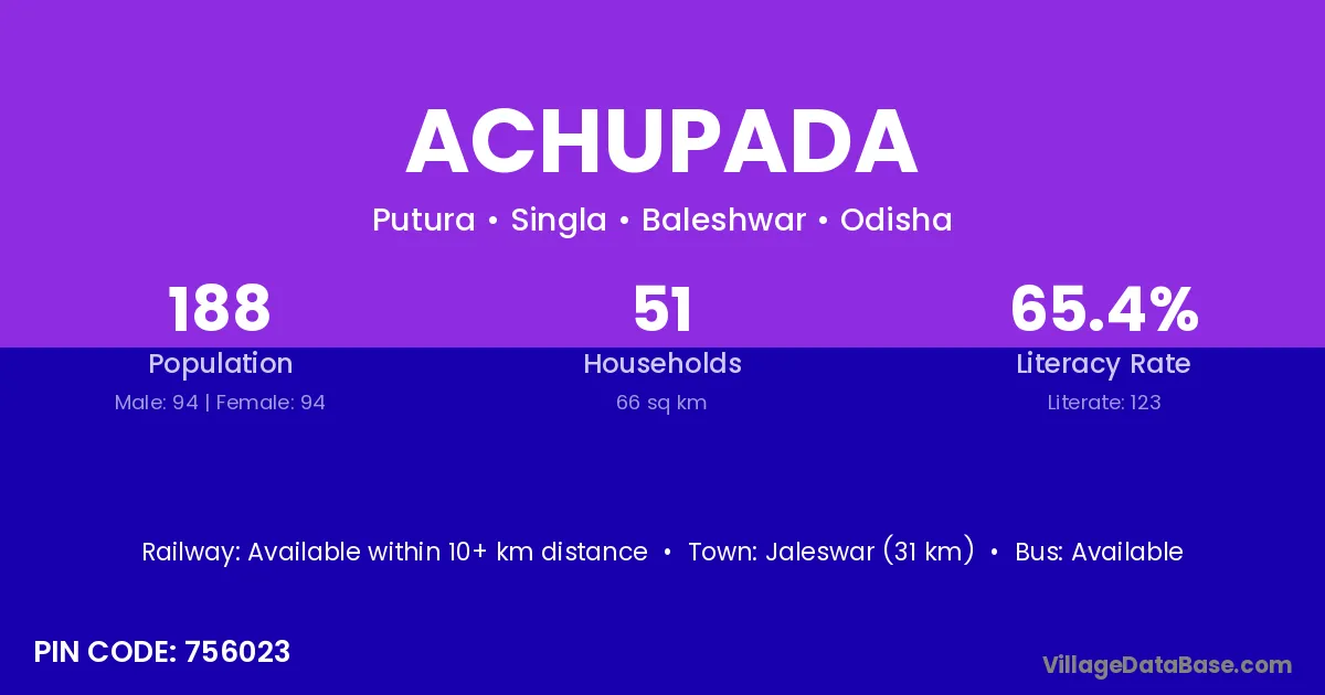 Jaleswar (31 km) is the nearest town to Achupada village for major economic activities and is located approximately 31 km away.