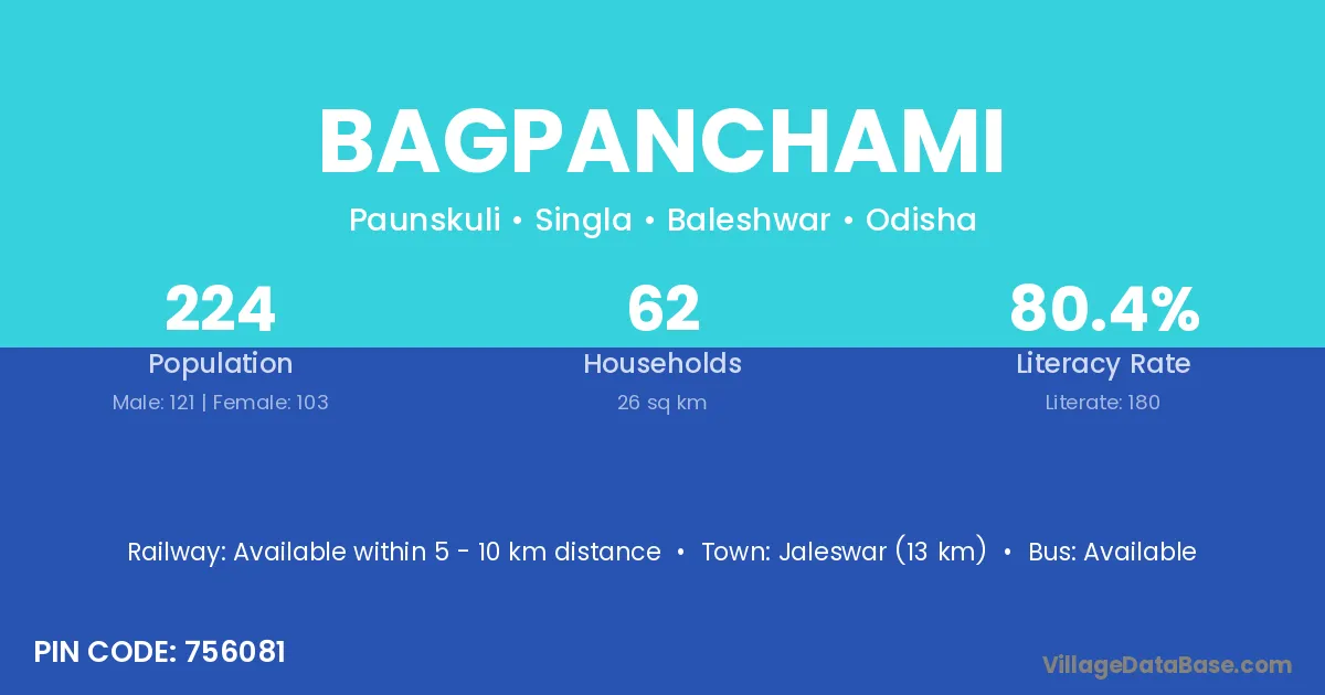 Jaleswar (13 km) is the nearest town to Bagpanchami village for major economic activities and is located approximately 13 km away.