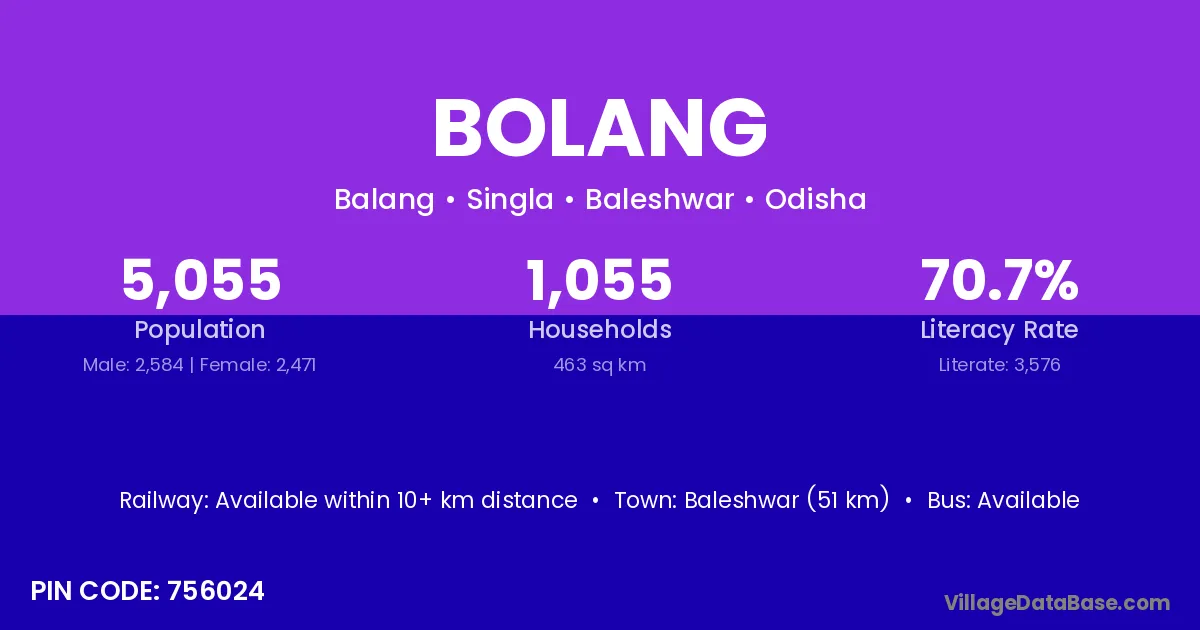 Baleshwar (51 km) is the nearest town to Bolang village for major economic activities and is located approximately 51 km away.