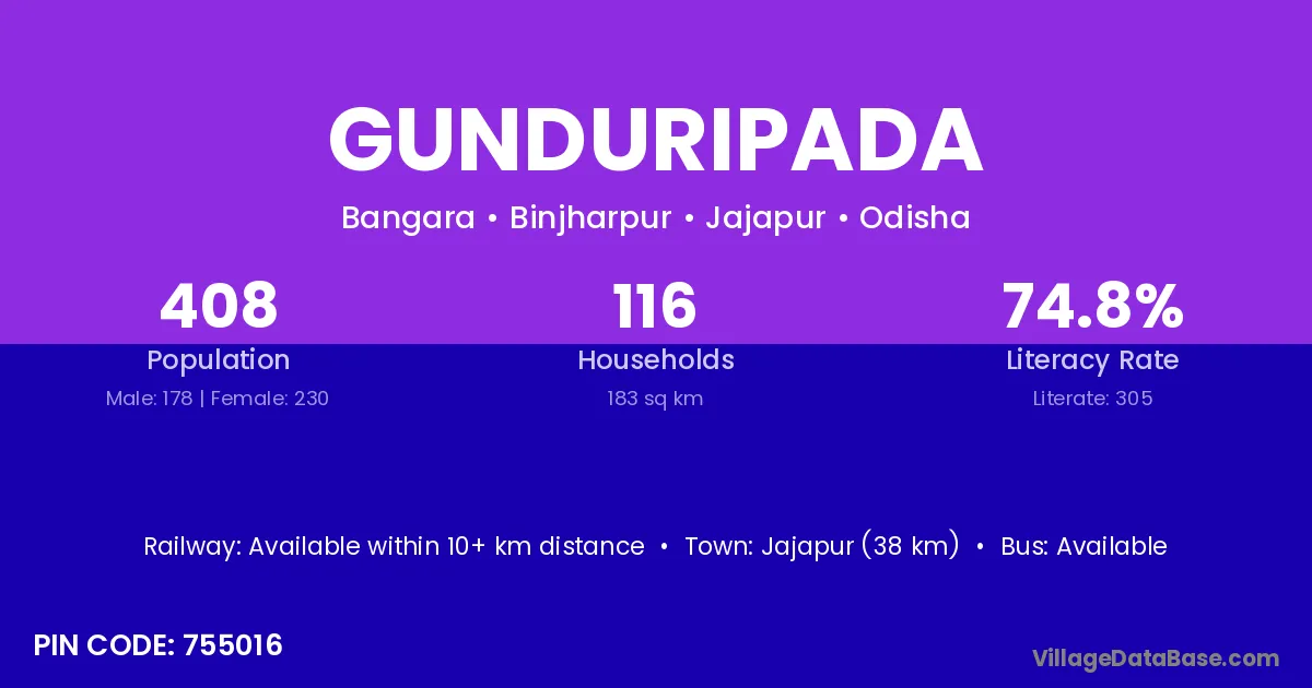 The literacy rate of Gunduripada village is 78.52%. Male literacy stands at 80.11% and female literacy at 76.84%.