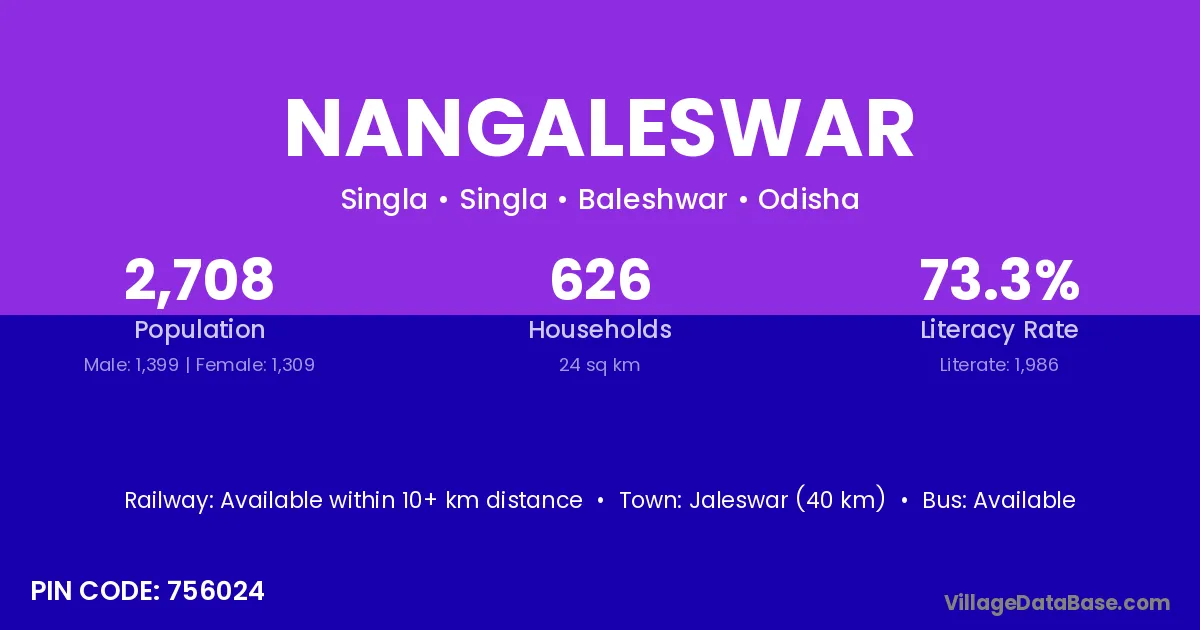 Jaleswar (40 km) is the nearest town to Nangaleswar village for major economic activities and is located approximately 40 km away.