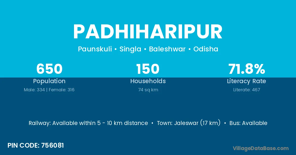 Jaleswar (17 km) is the nearest town to Padhiharipur village for major economic activities and is located approximately 17 km away.