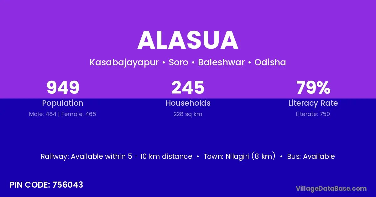 Nilagiri (8 km) is the nearest town to Alasua village for major economic activities and is located approximately 8 km away.