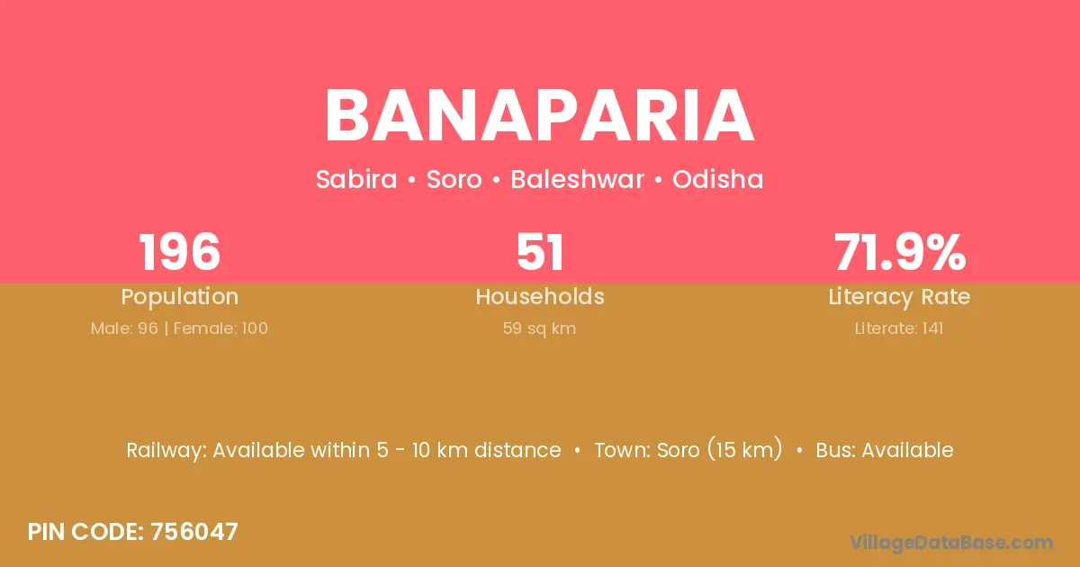 Banaparia village has a total population of 196 people, of which 96 are males and 100 are females.