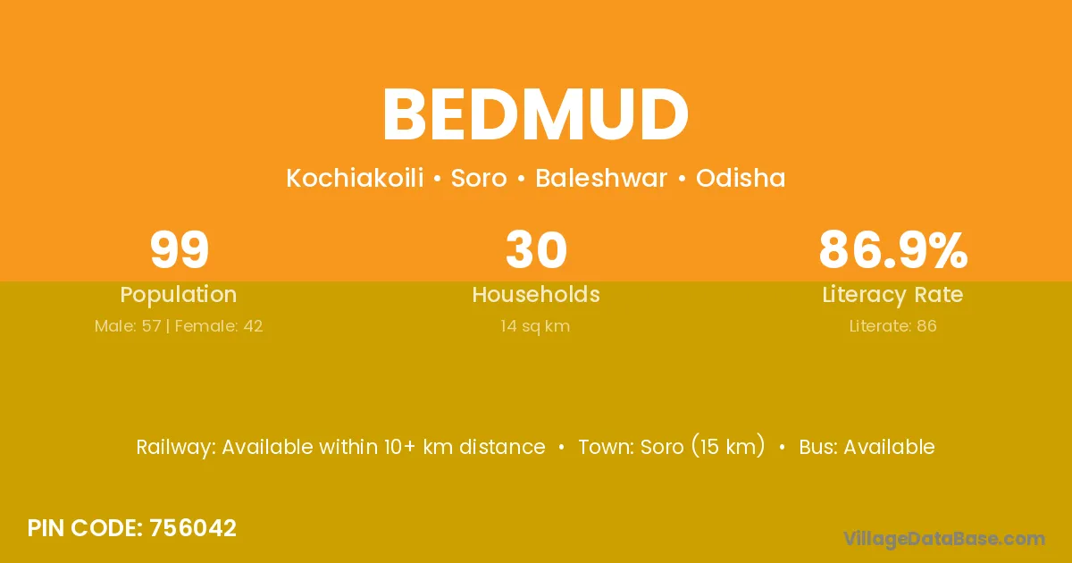 Soro (15 km) is the nearest town to Bedmud village for major economic activities and is located approximately 15 km away.