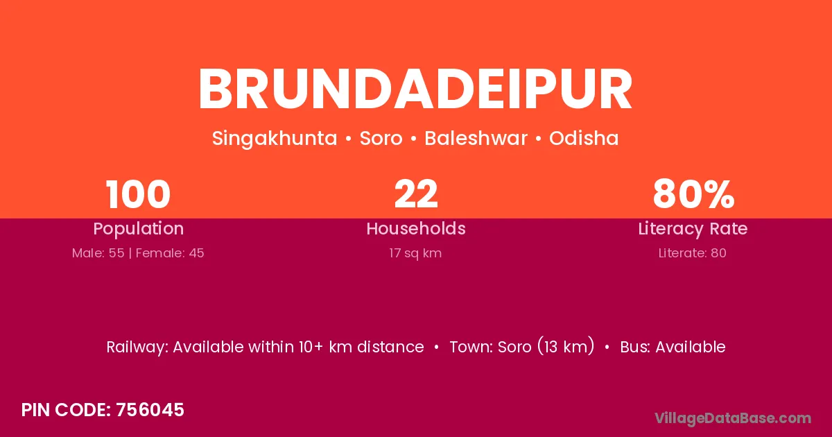 Soro (13 km) is the nearest town to Brundadeipur village for major economic activities and is located approximately 13 km away.