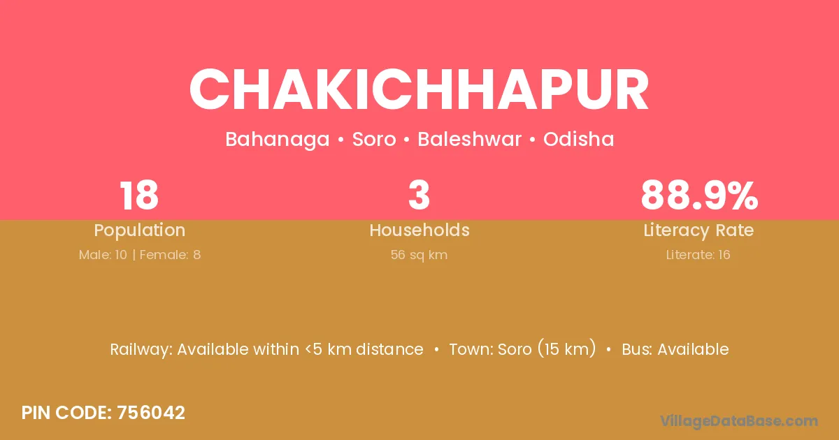 Soro (15 km) is the nearest town to Chakichhapur village for major economic activities and is located approximately 15 km away.