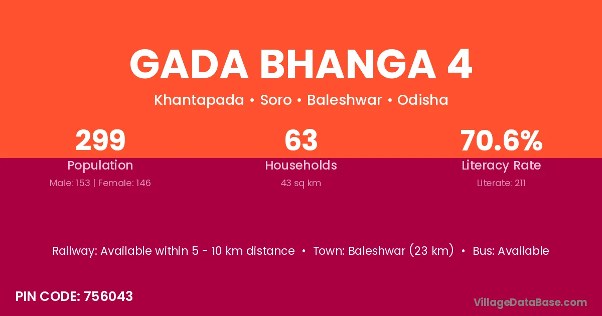 Baleshwar (23 km) is the nearest town to Gada Bhanga 4 village for major economic activities and is located approximately 23 km away.
