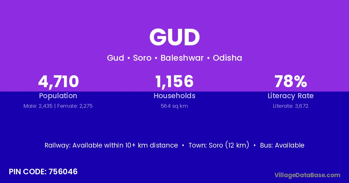 Soro (12 km) is the nearest town to Gud village for major economic activities and is located approximately 12 km away.