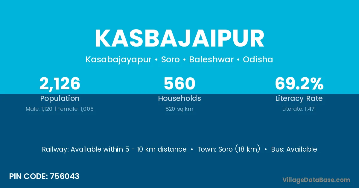 Soro (18 km) is the nearest town to Kasbajaipur village for major economic activities and is located approximately 18 km away.