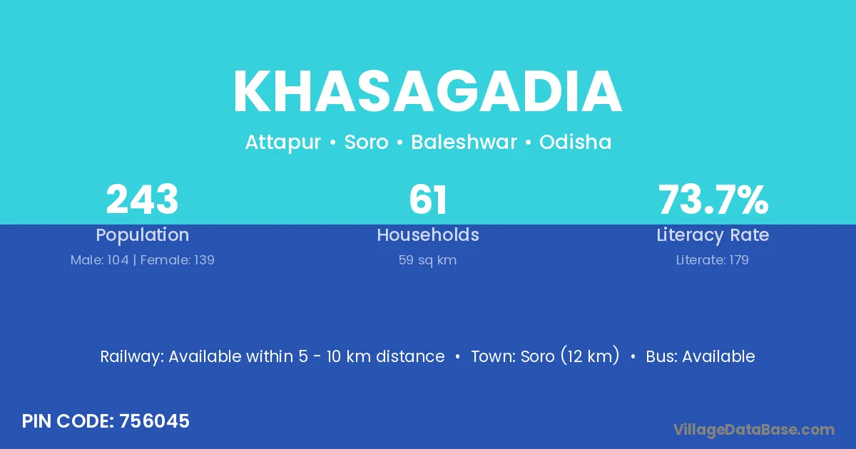 Soro (12 km) is the nearest town to Khasagadia village for major economic activities and is located approximately 12 km away.
