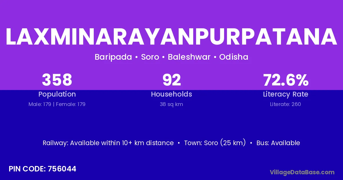 Laxminarayanpurpatana village has a total population of 358 people, of which 179 are males and 179 are females.