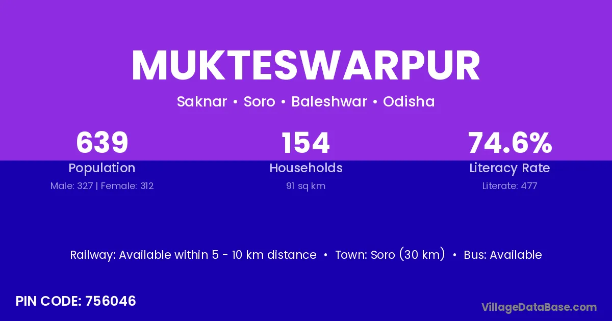 Soro (30 km) is the nearest town to Mukteswarpur village for major economic activities and is located approximately 30 km away.