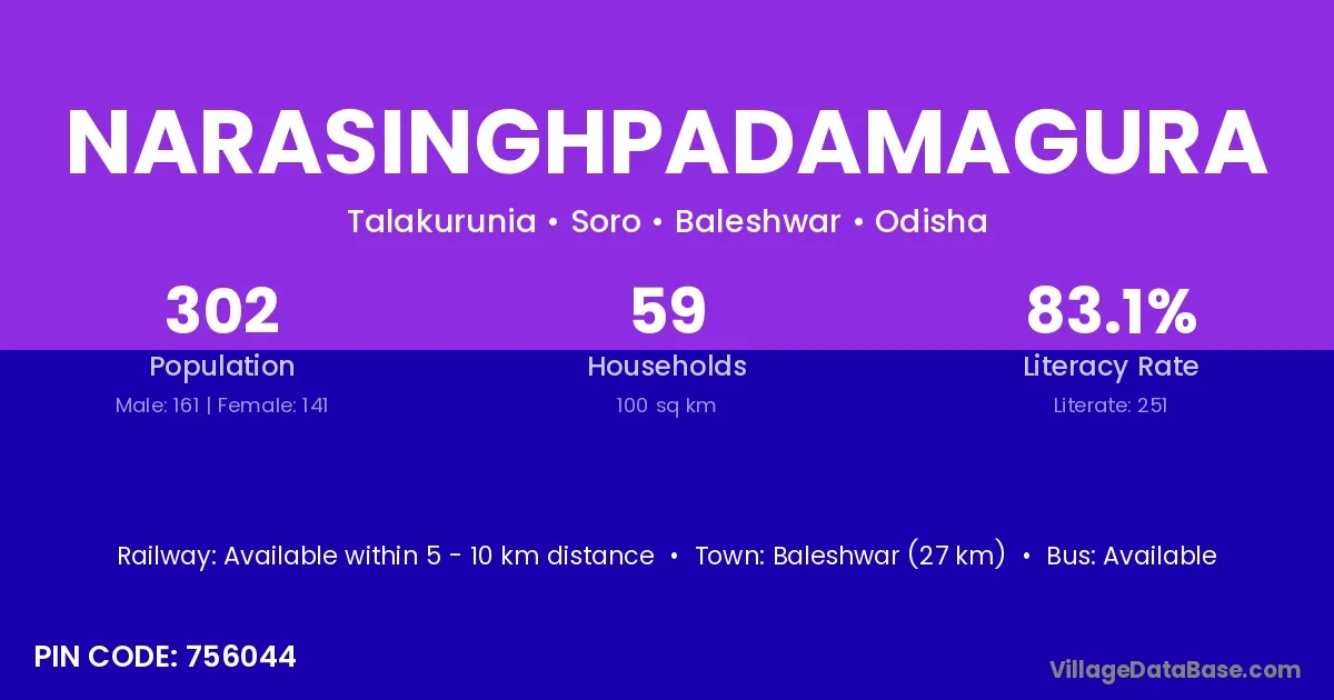 Baleshwar (27 km) is the nearest town to Narasinghpadamagura village for major economic activities and is located approximately 27 km away.