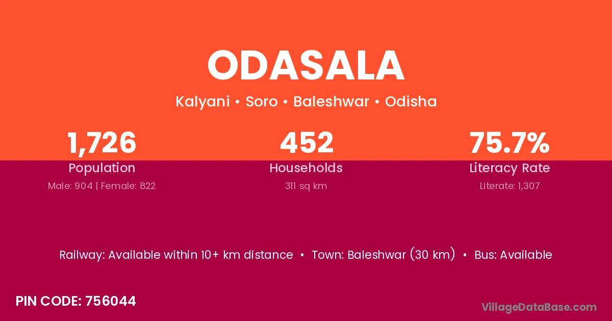 Baleshwar (30 km) is the nearest town to Odasala village for major economic activities and is located approximately 30 km away.