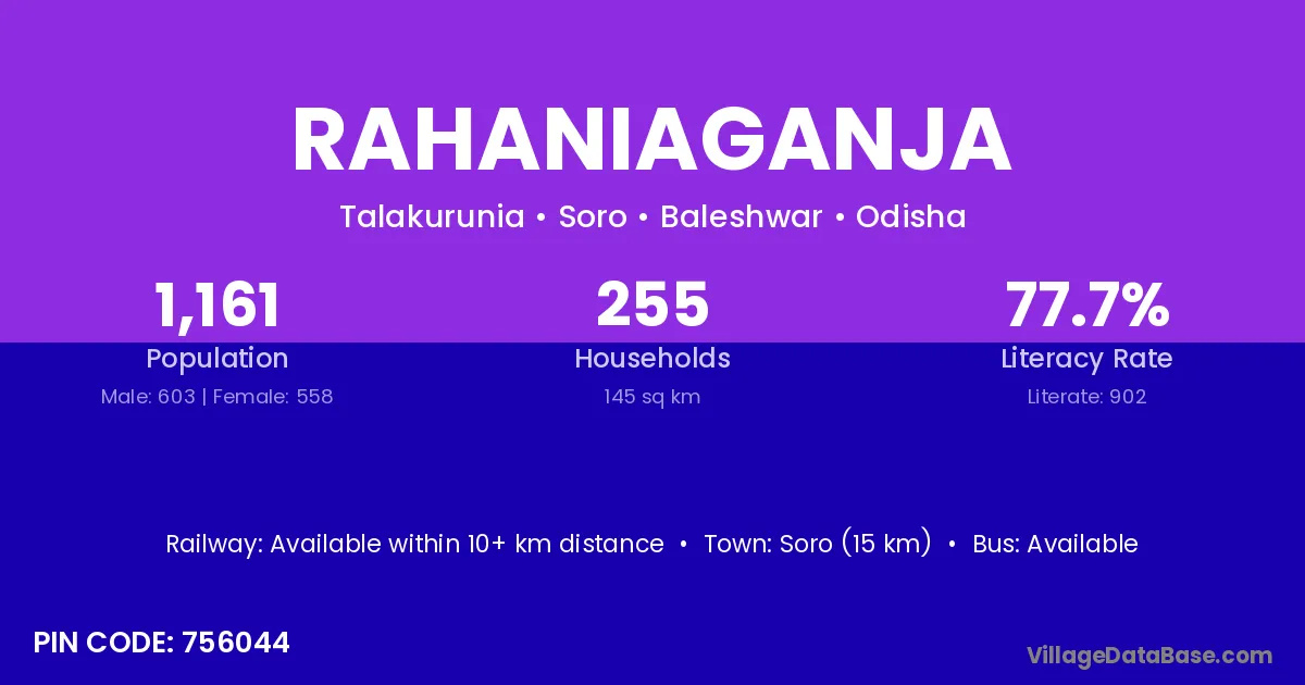 Soro (15 km) is the nearest town to Rahaniaganja village for major economic activities and is located approximately 15 km away.