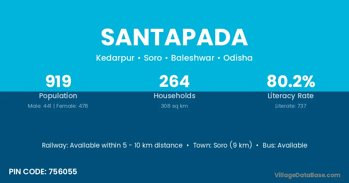 Soro (9 km) is the nearest town to Santapada village for major economic activities and is located approximately 9 km away.